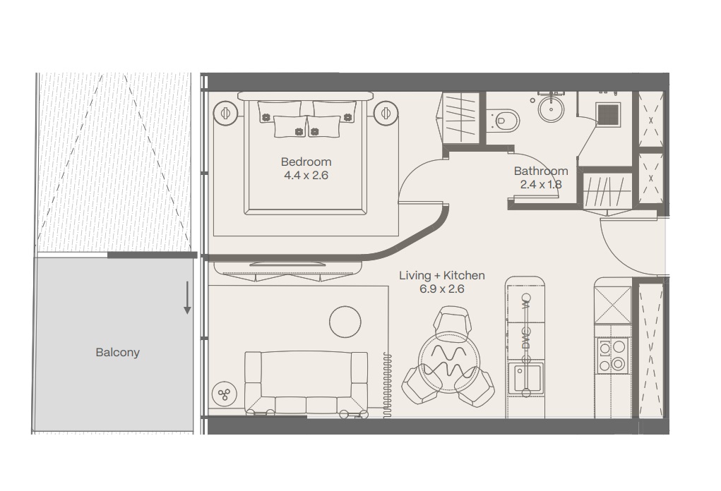 The layout of the 1-bedroom junior apartment in the Panorama by Elie Saab Sea Breeze project is designed to provide maximum comfort. It includes a living room, kitchen, bedroom, bathroom, and a spacious balcony accessible from the living room.